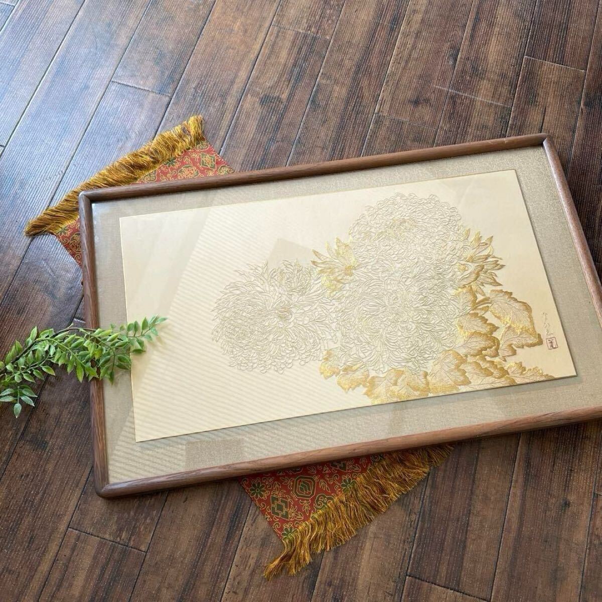 > wasabi k568 額装刺繍絵「菊花」錦糸で線画調に描かれた繊細なキク 余白が美しい逸品 ガラス板 和のインテリア ヴィンテージ 骨董品