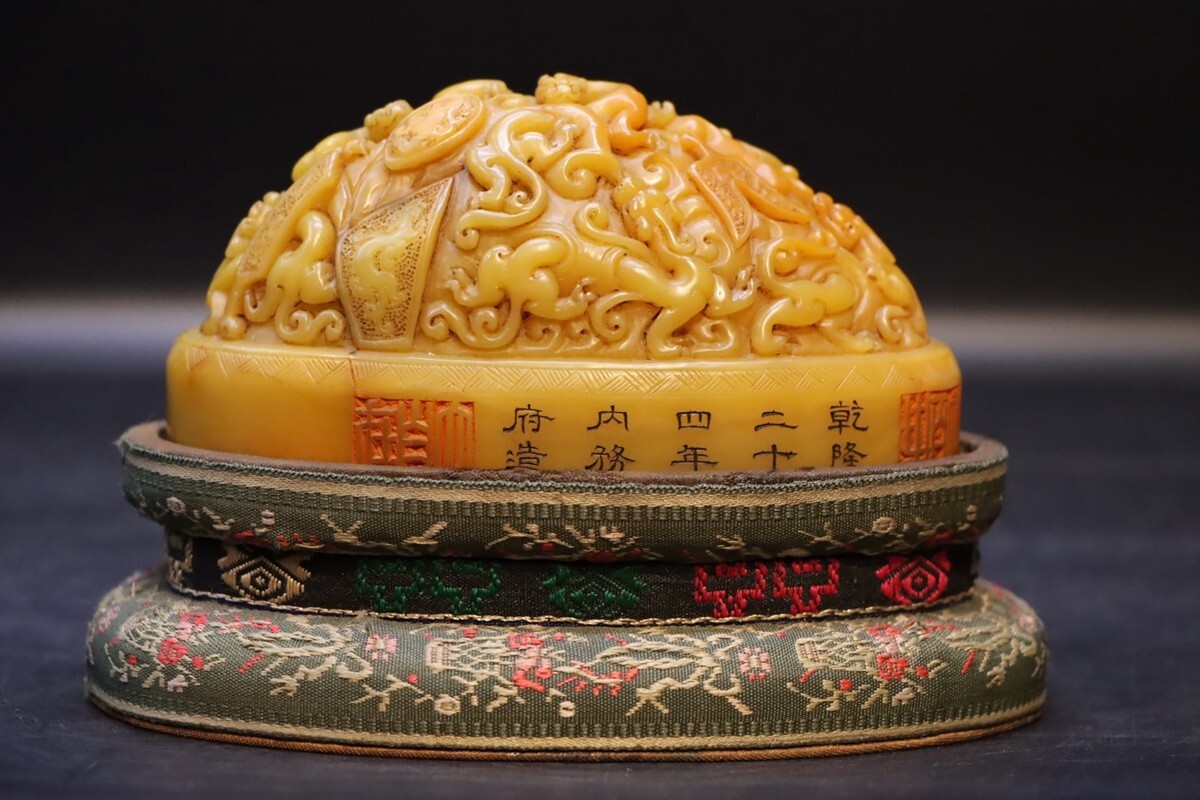 - 「清 乾隆二十四年内務府造 老寿山石 田黄石彫り 赤龍古獣官印」極細工 擺件 古賞物 中国古美術 旧蔵出