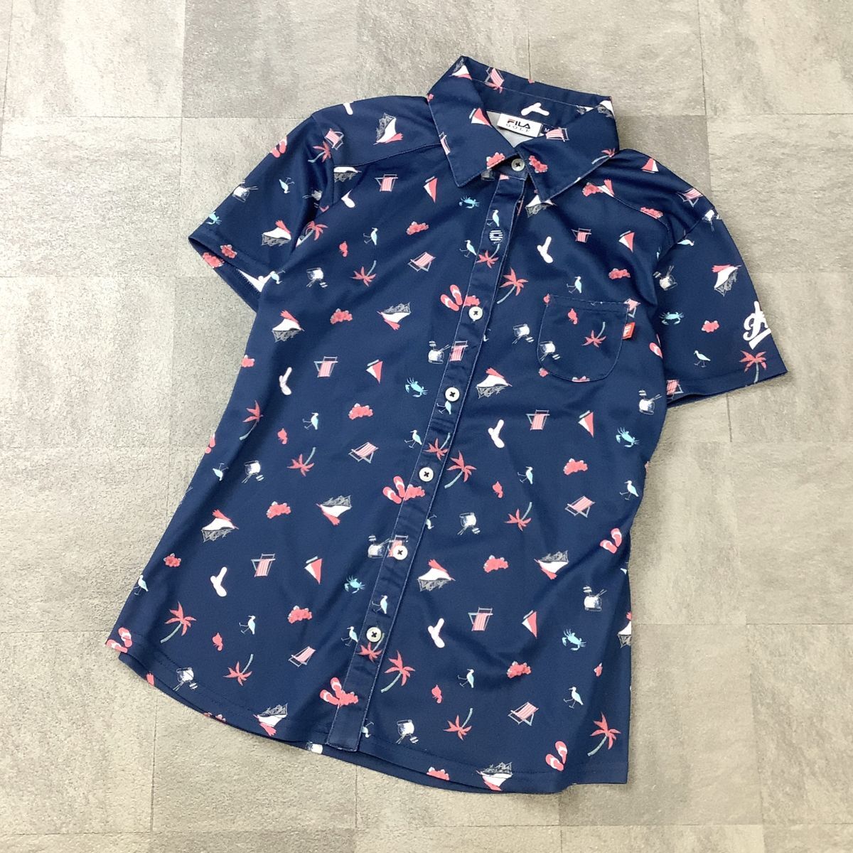 > FILA GOLF フィラゴルフ 総柄 ビーチ柄 半袖 シャツ ゴルフシャツ レディース M ネイビー