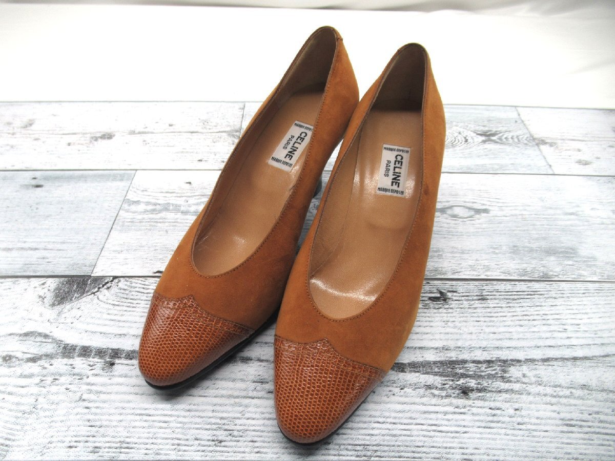 > ★【B送900円】2239 CELINE セリーヌ レザーパンプス ウィングチップ スエード ブラウン イタリア製 アーモンドトゥ 35
