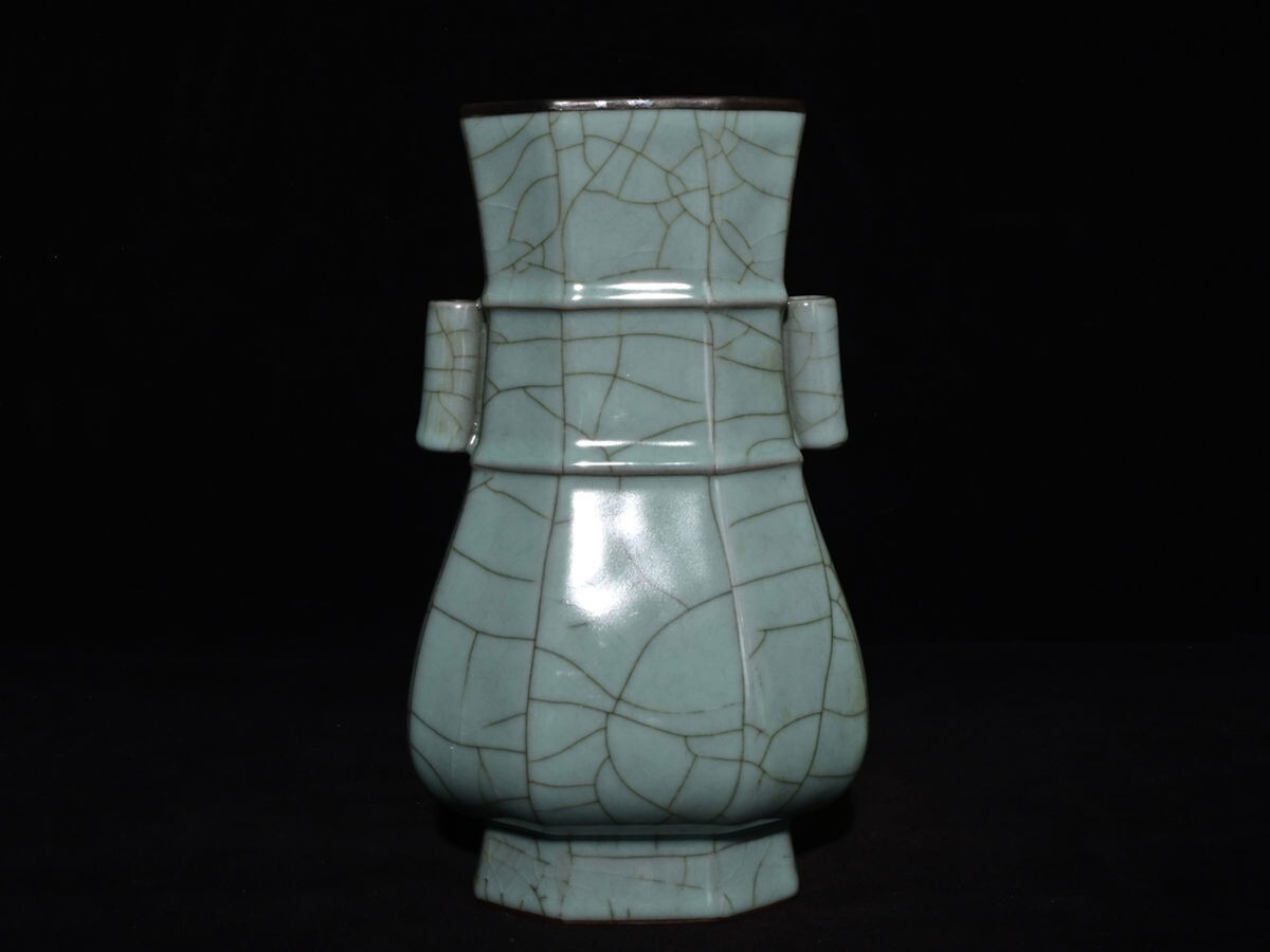 - 「宋 官窯 陶磁器 灰青釉 嵌銀口 貫耳瓶」染付 置物 擺件 古賞物 中国古美術 旧蔵出