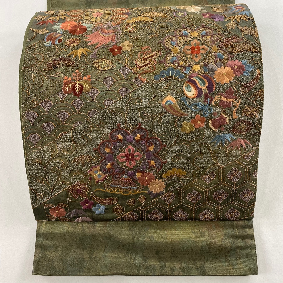 > 袋帯 美品 秀品 華文 宝尽くし 刺繍 茶緑色 お太鼓柄 正絹 【中古】