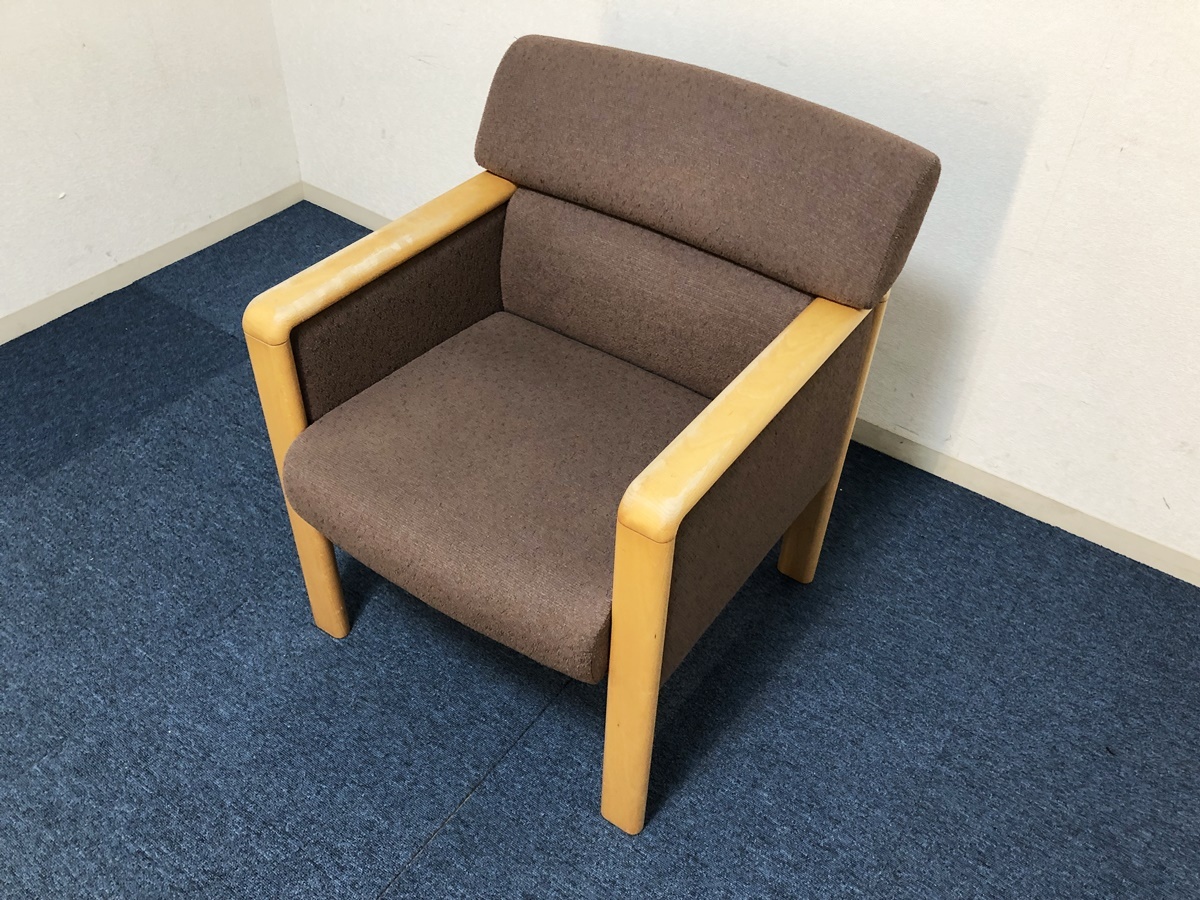 > okamura 高級イージーチェア 1人用ソファ 布生地ブラウン生地 肘/脚メープル 北欧カントリー調オカムラ応接ソファ ロビーソファ完成品3
