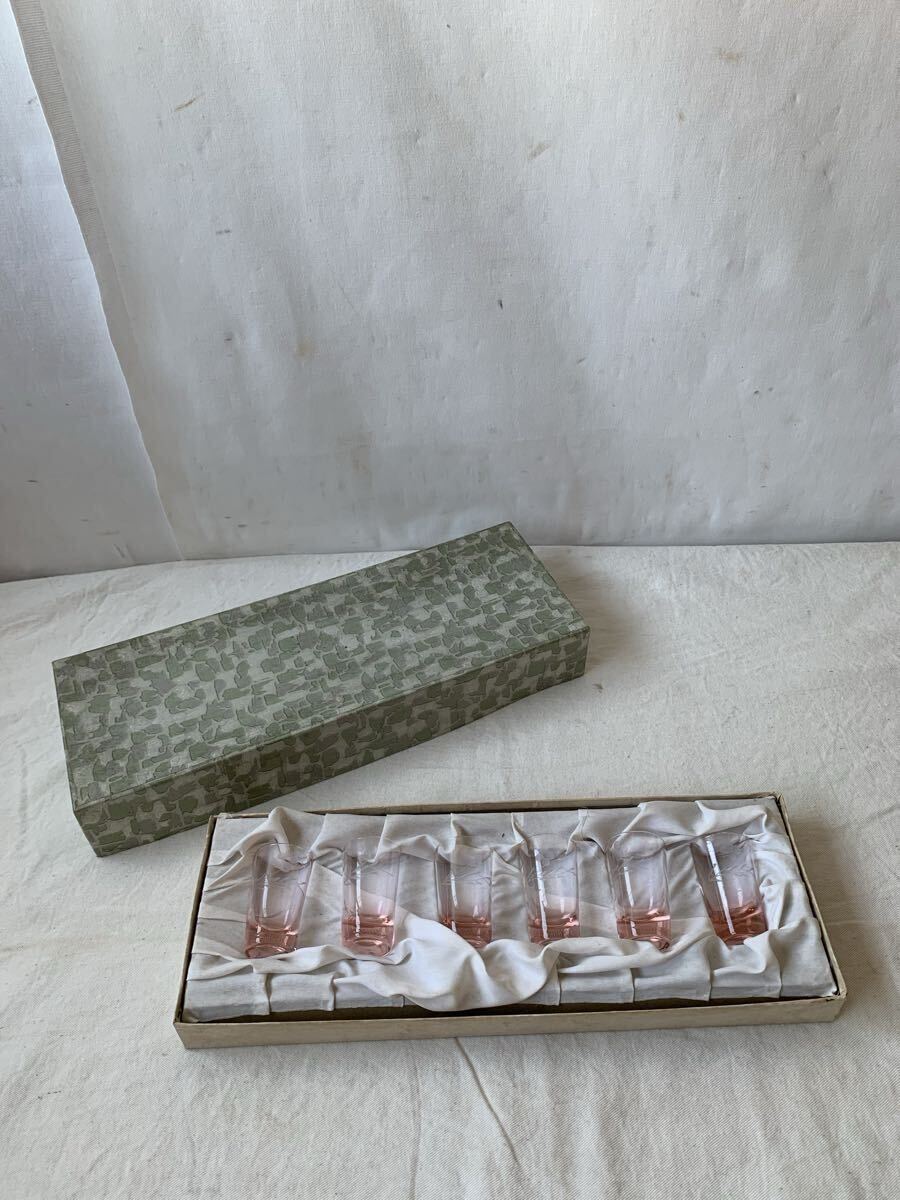 - 旧家蔵出し 箱入りデッドストック デザインが素敵な色硝子器6個セット ショットグラスアンティークビンテージ古道具インテリアコレクション