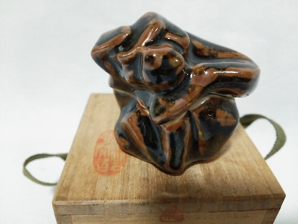 - ★【一美堂】★茶道具★龍珠 泰山作★鉄釉『猿 香合』★共箱付★