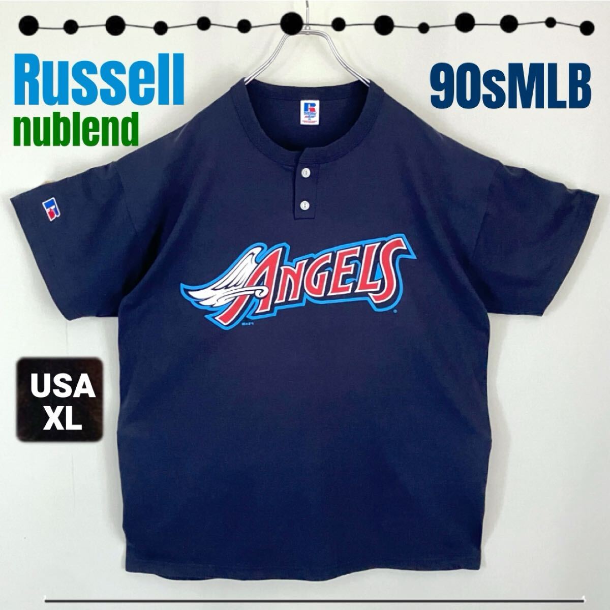 - 【美品/90-00s】ラッセル/ヘンリーネックTシャツ★MLB/アナハイム エンジェルス/90sロゴ★RUSSEL nublend★USAメンズXL