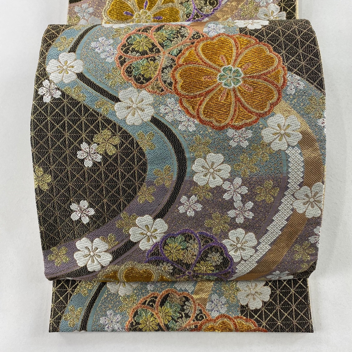 > 袋帯 美品 秀品 桜 流水 箔 唐織 黒 六通 正絹 【中古】