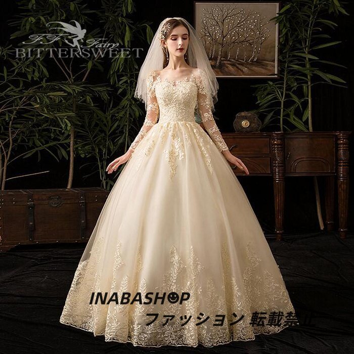 - ウェディングドレス カラードレス ウエディングドレス 長袖 床付きタイプ Aライン ロング 編み上げタイプ 披露宴 結婚式 海外挙式ドレス