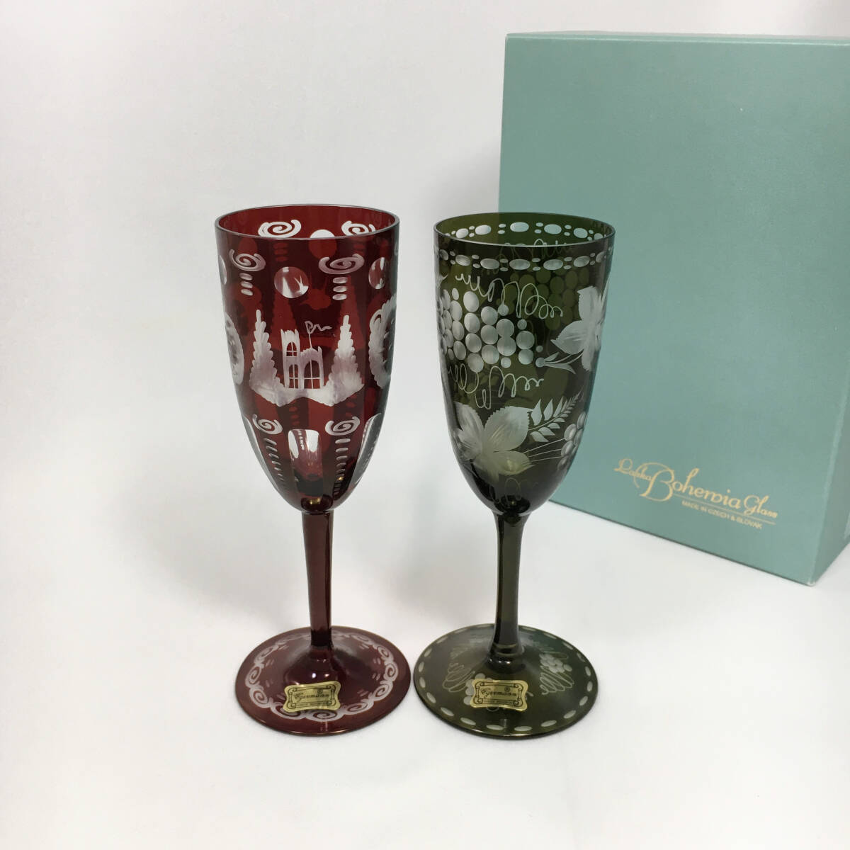 - エーゲルマン シャンパングラス 2客セット レッド グリーン 色被せ 絵変わり ペア ボヘミアガラス シャンパンフルート Egermann
