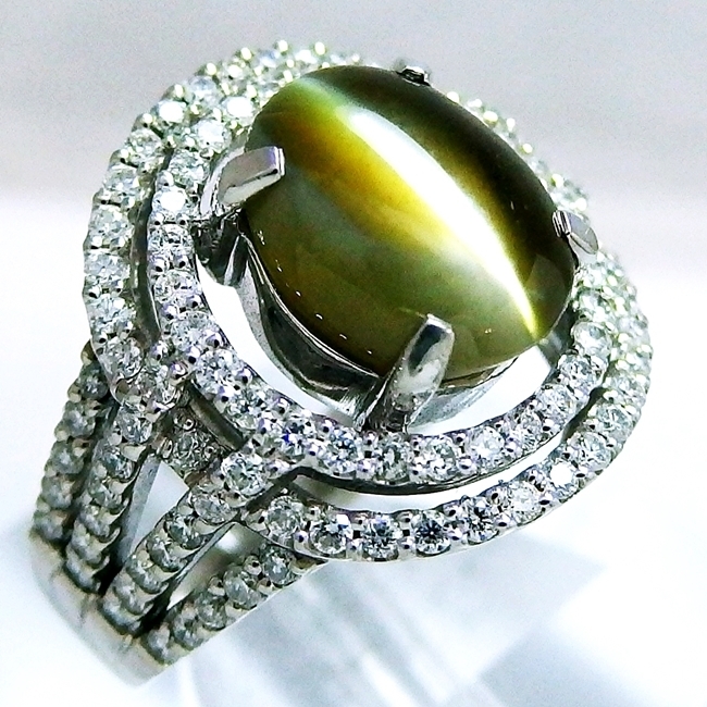 > Pt900★リング ◆クリソベリルキャッツアイ5.48ct ◇ダイヤ0.83ct ●12号◆ソーティング付き 【中古】 /mj266/25970/10006505