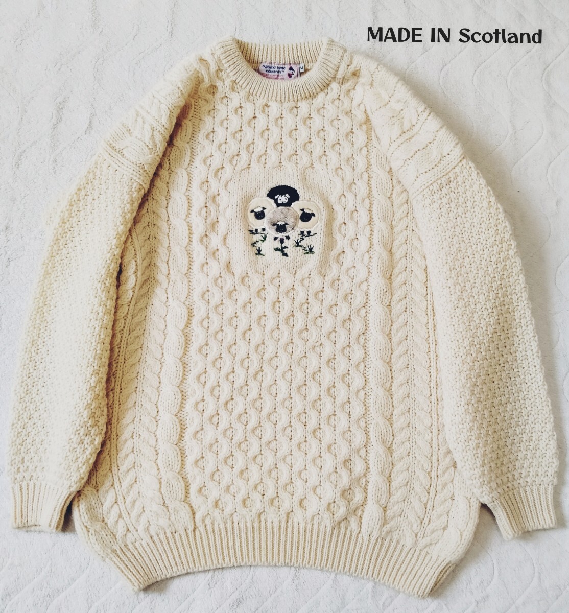 > スコットランド製*フィッシャーマンニット*ひつじ刺繍*アラン*ケーブル*セーター*HIGHLAND HOME INDUSTRIES*メンズLくらい*手洗い可*ウール