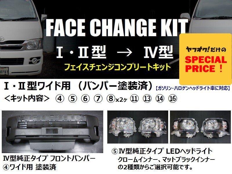 > □ ハイエース 200系 ワイドボディ [1型・2型 → 4型] フェイスチェンジ キット バンパー塗装済み S-GL ワゴンGL グランドキャビン HIACE