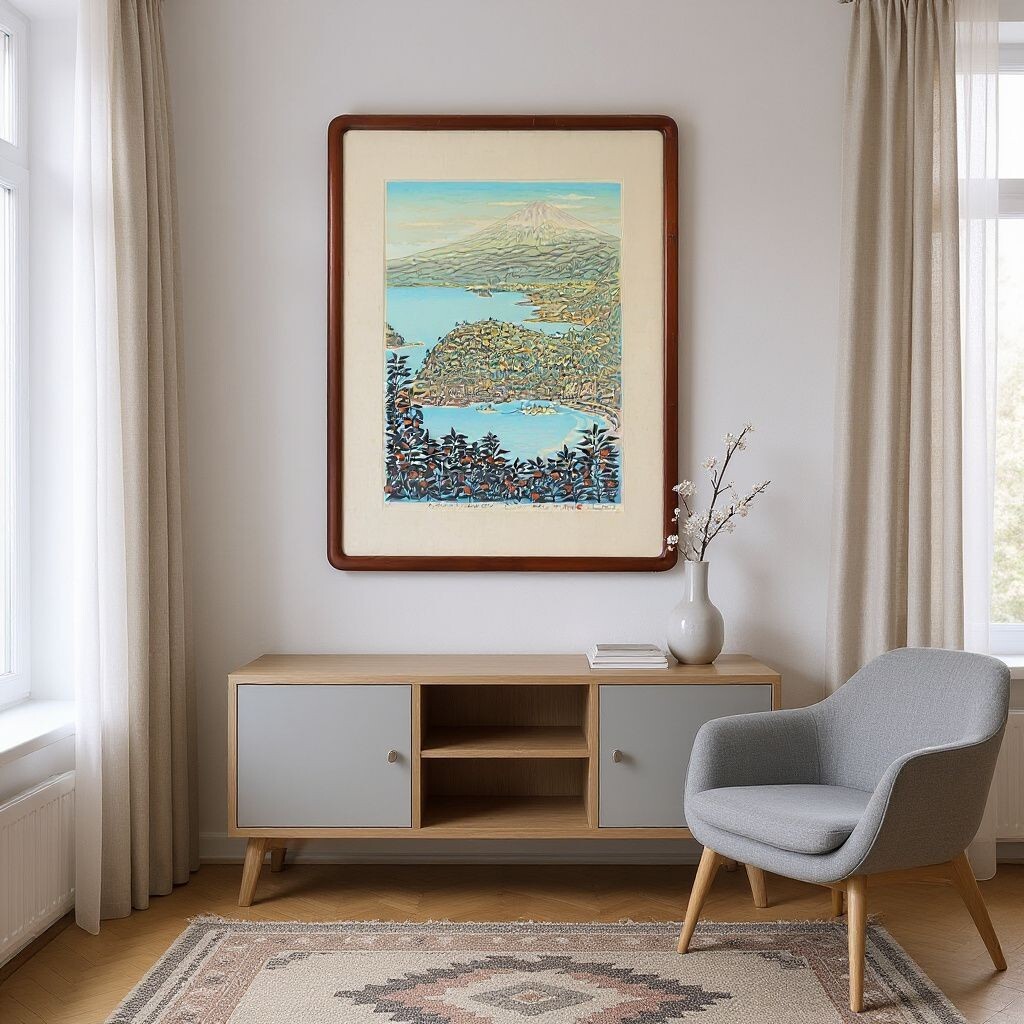 > 真作 浦田周社 1987年木版画「冬うらら 西伊豆にて」画寸39×53cm 静岡県出身 六世版隈 沼津市西浦のミカン畑から駿河湾越しの富士山 11308
