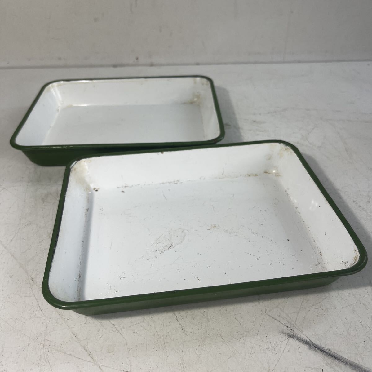 - ホーローバット 角バット 琺瑯バット トレイ ミニサイズ グリーン 2枚セット まとめて ビンテージ レトロ 当時物 古道具 現状品
