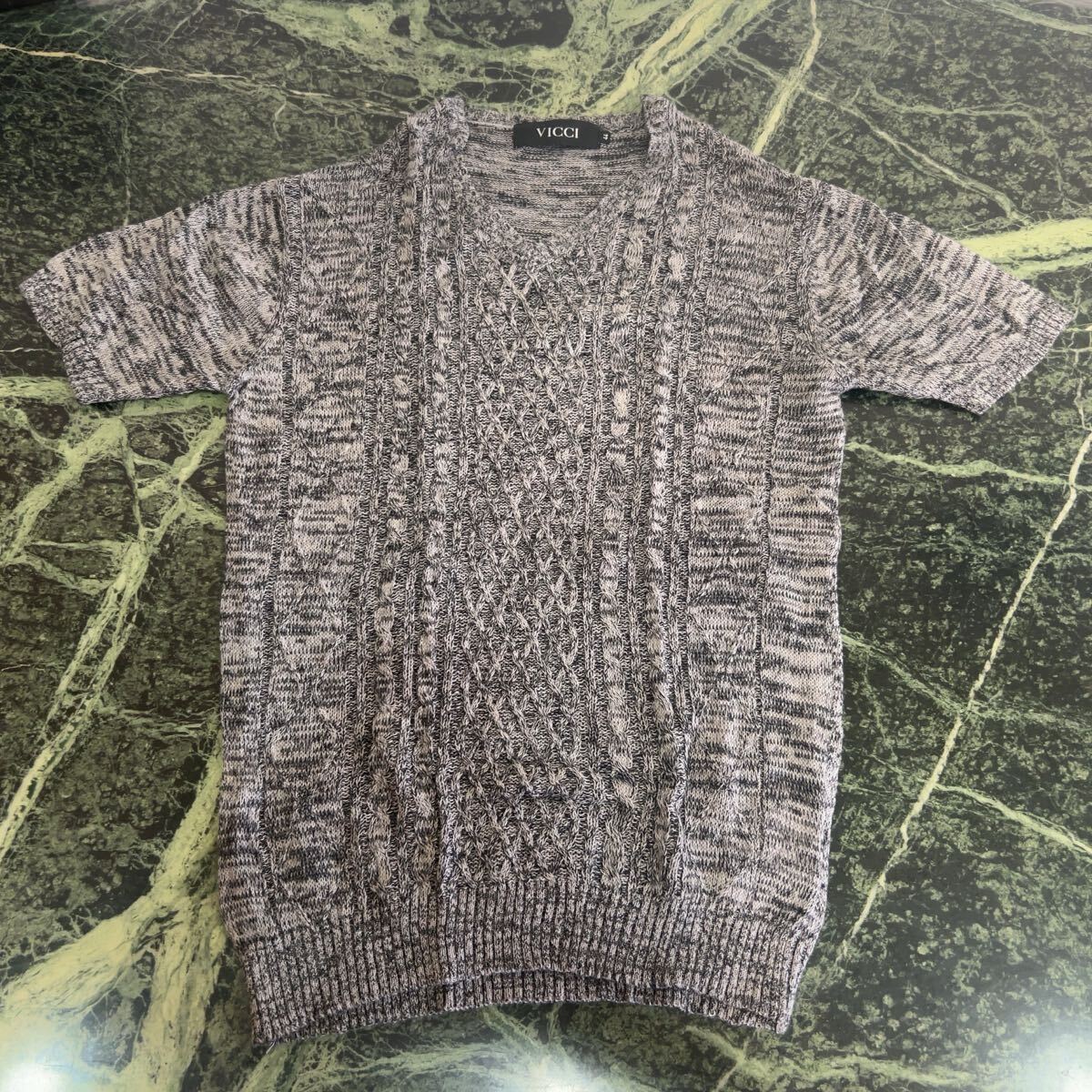 - 【美品】VICCI★ニットカットソー Mサイズ グレー 44サイズ Vネック 麻×綿 ケーブルニット 五分袖 半袖 トップス ビッチ ヴィッチ