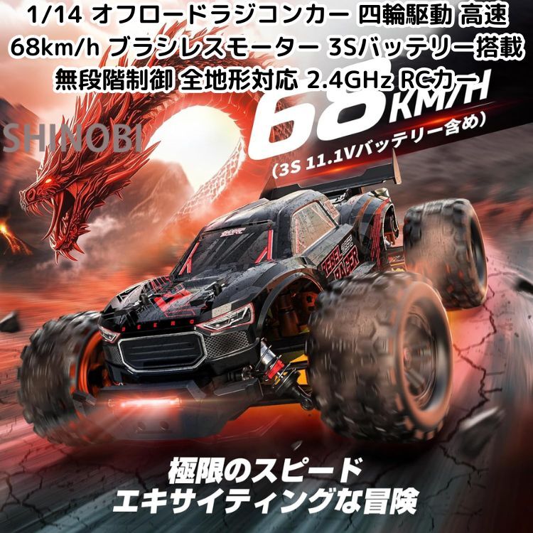 - 1/14 オフロードラジコンカー 四輪駆動 高速68km/h ブラシレスモーター 3Sバッテリー搭載 無段階制御 全地形対応 2.4GHz RCカー