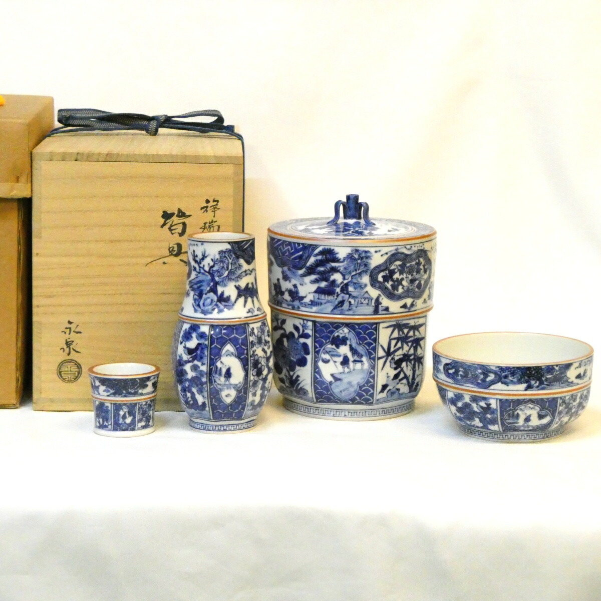 - 【八月の特売品】平安 勝見永泉作 祥瑞 皆具 染付 一揃 茶道具【中古 美品】