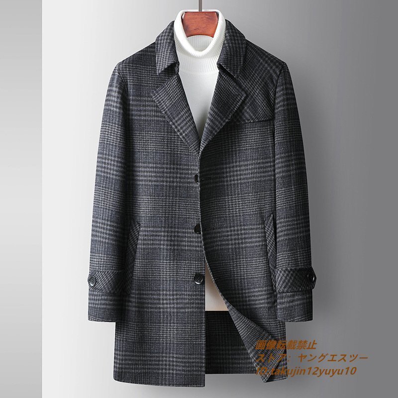 > 超美品*ウールコート メンズコート チェック柄 ロングコート 紳士服 ビジネスコート カシミヤ アウター チェスターコート グレー① XL