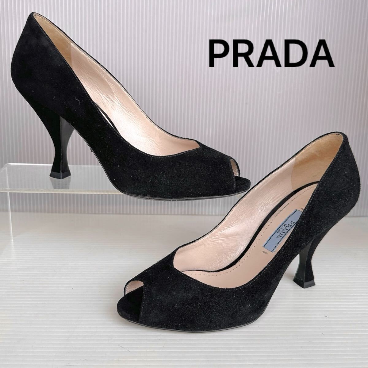 > PRADA プラダ 定番 ハイヒール ピンヒール パンプス サンダル オープントゥ 極美品 レーディス 靴 35 シューズ ブラック スエードレザー