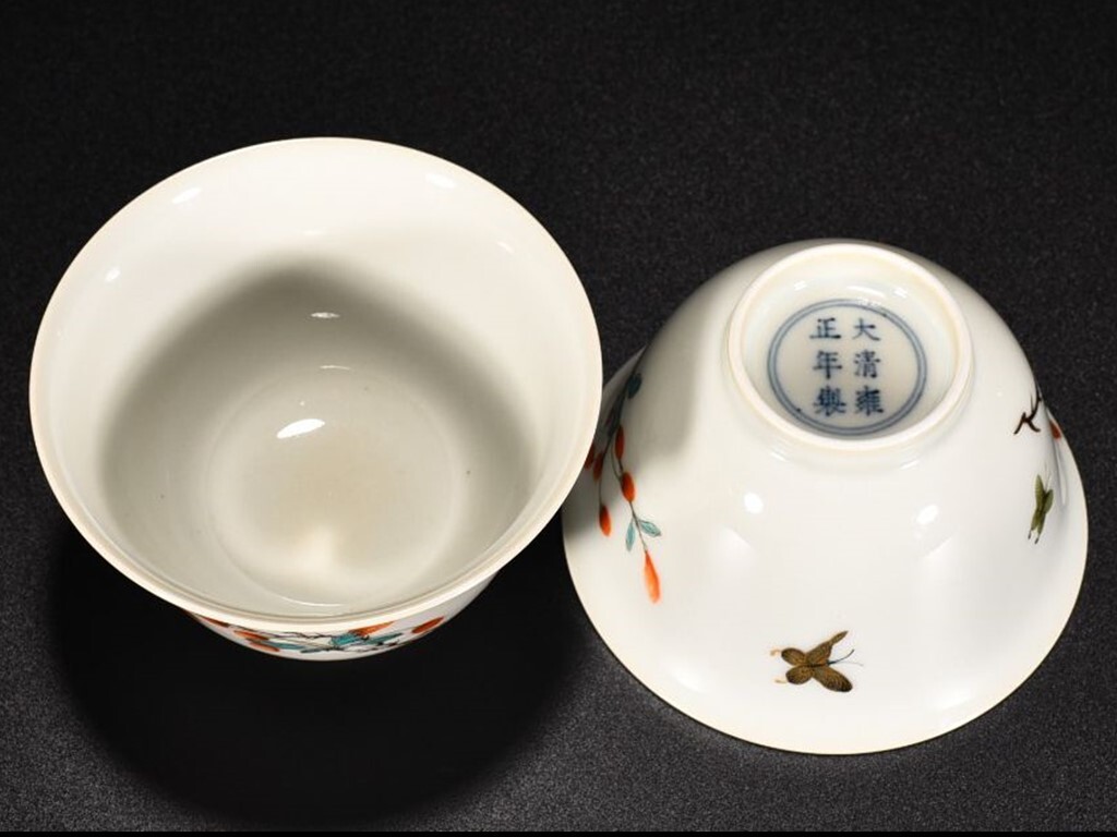 - TD158■清雍正年製款 粉彩描金蝶恋花卉紋杯2客 珍品 時代物 古玩 唐物 古陶磁器■