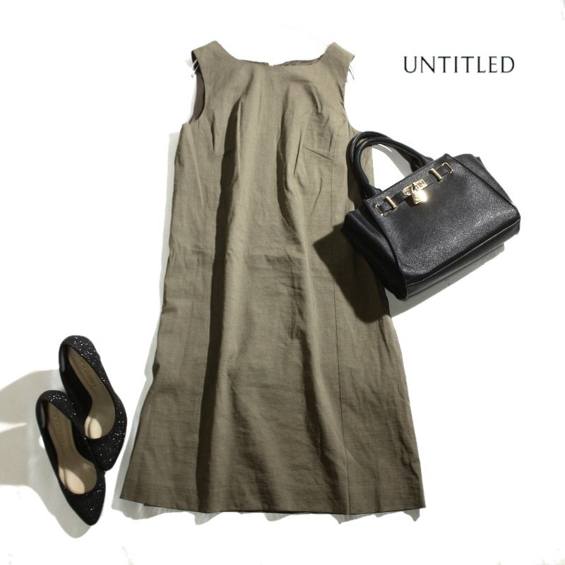 > 美品 アンタイトル UNTITLED 株) ワールド 夏 ストレッチ 楽ちん 綺麗め リネン ノースリーブワンピース 9号 2 カーキグリーン 緑 ミセス