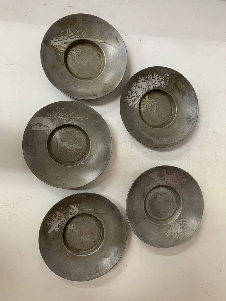 - N2191 錫製「乾茂號」造 花文図柄茶托五客揃 幅約10cm