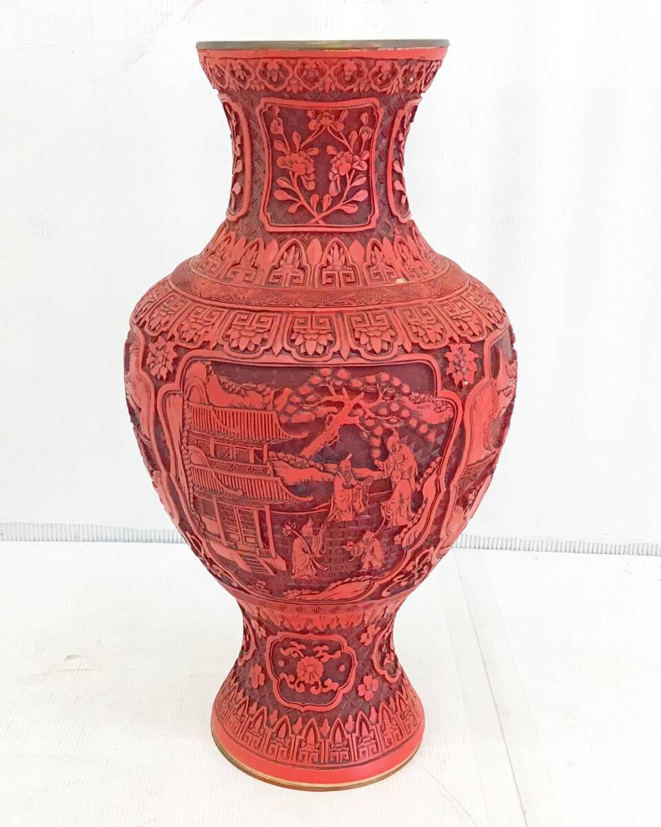 - 堆朱 花瓶 花入 花生 花插 花器 飾瓶 壷 壺 蓋付壷 蓋付き 蓋物 横幅約25㎝ 口径約15㎝ 高さ約48㎝ 漆器 漆芸 中国美術 赤色