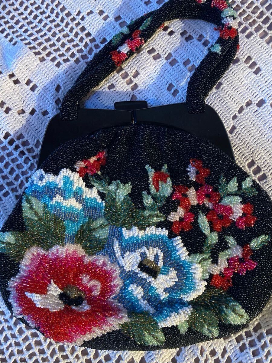- 【美品】総ビーズ 大ぶりハンドバッグ 牡丹柄 がま口タイプ クラッチ留め★