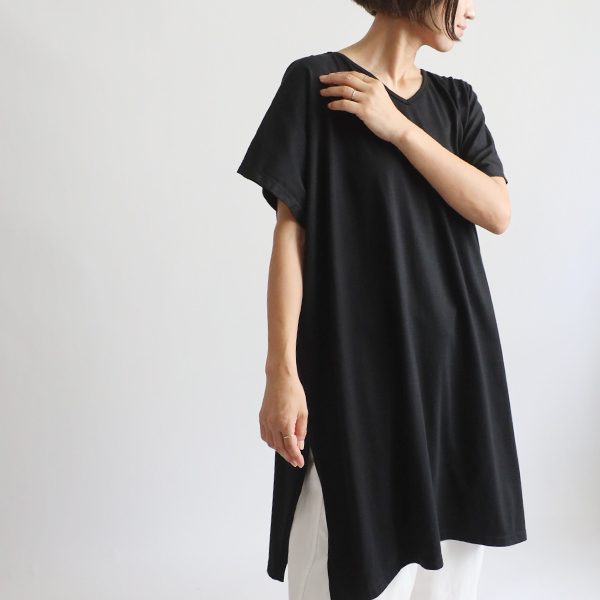 > 秋SALE 98cm 度詰め天竺コットン100%Tシャツ生地 プルオーバーTシャツ チュニック サイド右横スリット 黒 F10