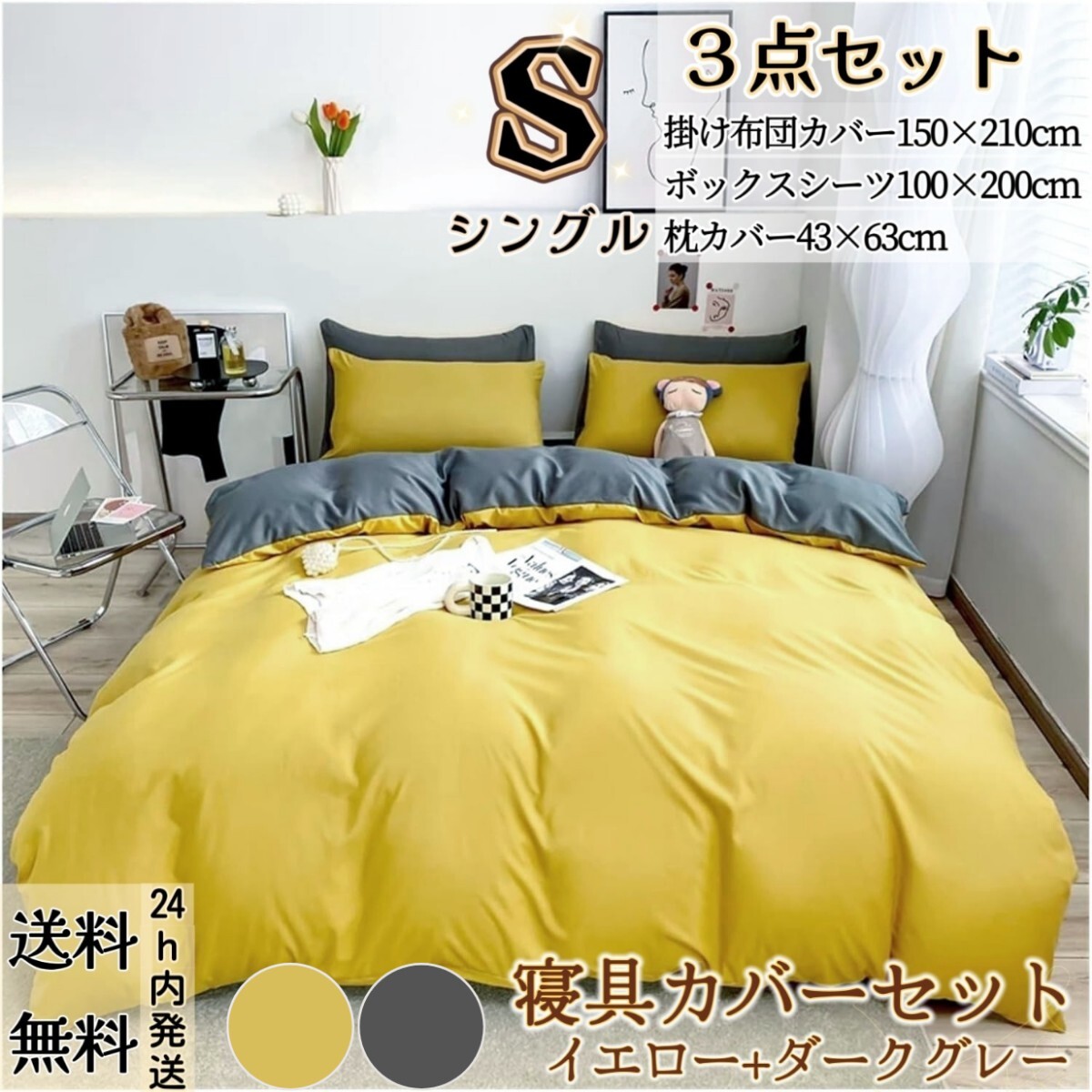 - 布団カバー シングル3点セット 寝具カバーセット 掛け布団カバー ボックスシーツ 枕カバー 洋式和式兼用 冬夏兼用 イエロー+ダークグレー