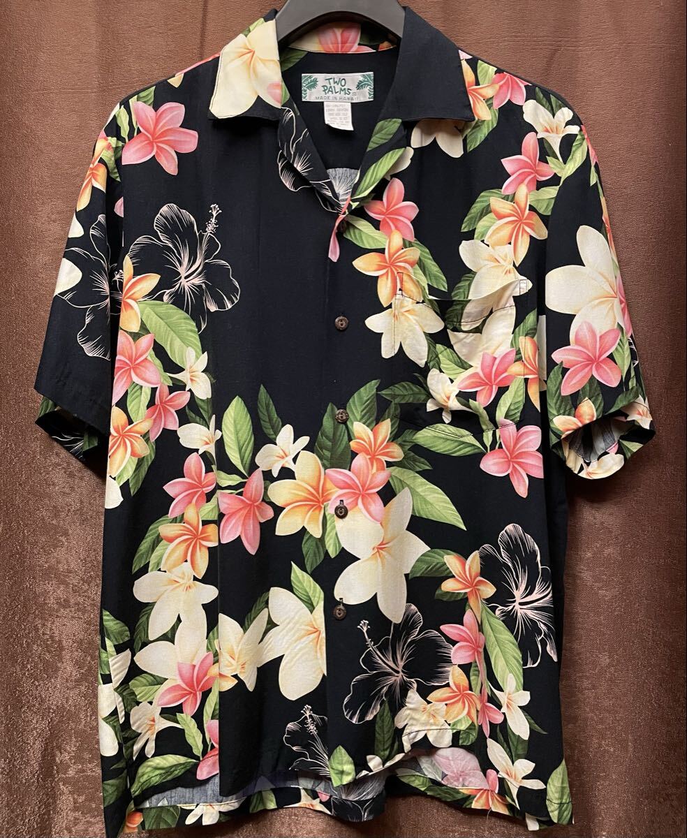 > MADE IN HAWAII製 TWO PALMS 半袖 花柄 アロハシャツ ブラック Mサイズ トゥーパームス ハワイ製 ハワイ 半袖シャツ 開襟シャツ 黒