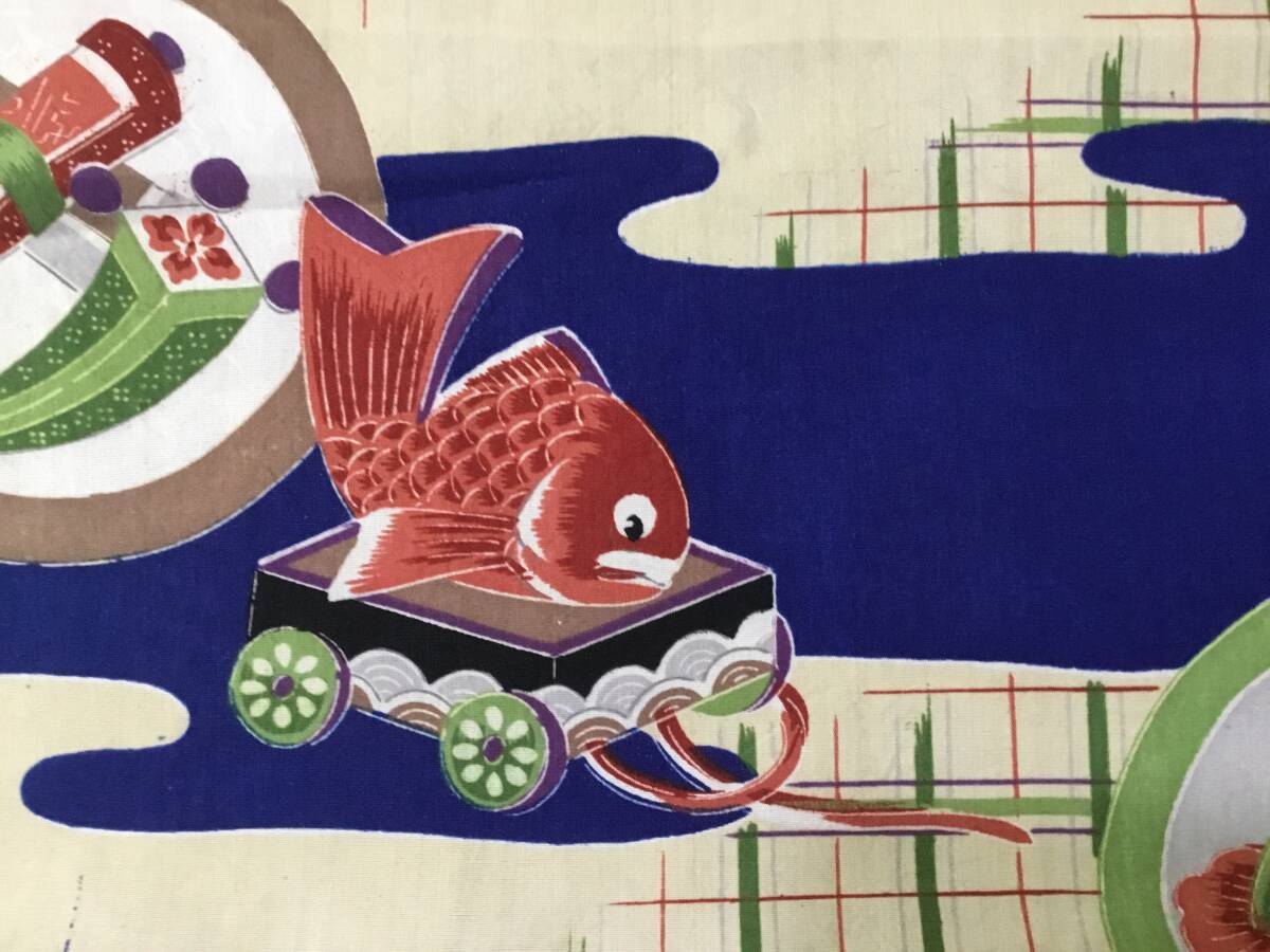 - 古布875・絹ハギレ(鯛車・鶴・春駒・僅か柄) 時代着物地