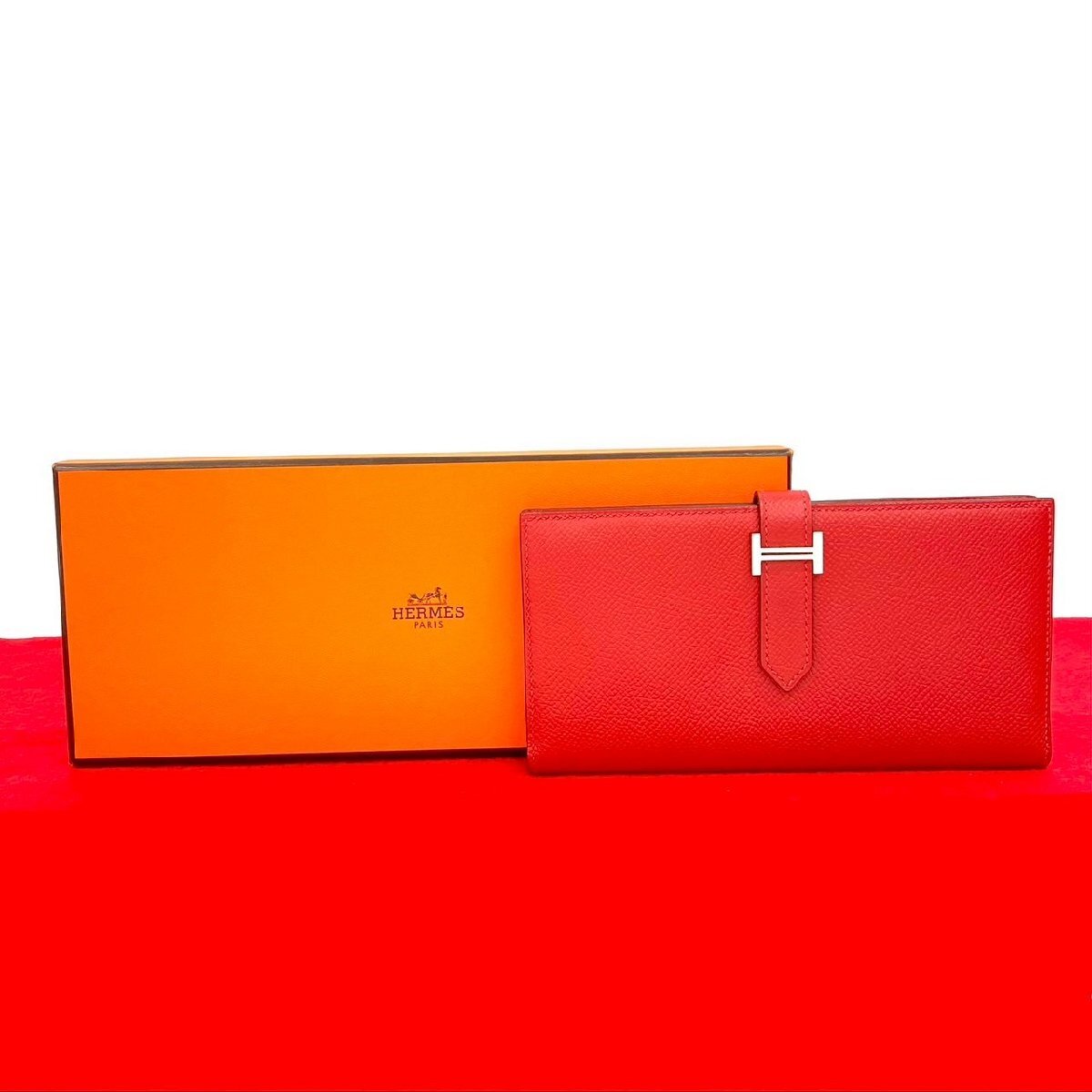 > ほぼ未使用 箱付 Z 刻印 HERMES エルメス ベアン スフレ ヴォーエプソン レザー 本革 二つ折り 長財布 ウォレット 札入れ レッド m866b
