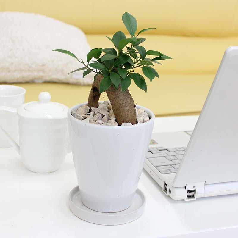 - 観葉植物 幸せを見守る樹 ガジュマル 5号 ホワイト陶器鉢 丸ロング 1鉢 土の表面 化粧石