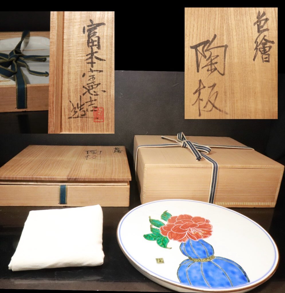 - 【hiro】奈良が生んだ陶芸の巨匠!人間国宝 富本 憲吉 造 美術館級!色繪椿陶板 共箱(二重箱) ★検索★ 金彩 盃 工藝 皿 民藝 宗悦