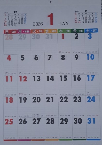 - 【1冊:見やすい カラー カラフル カレンダー:A5:21x15cm 2026年】★見やすい 大文字★六曜:壁掛け:令和8:No4