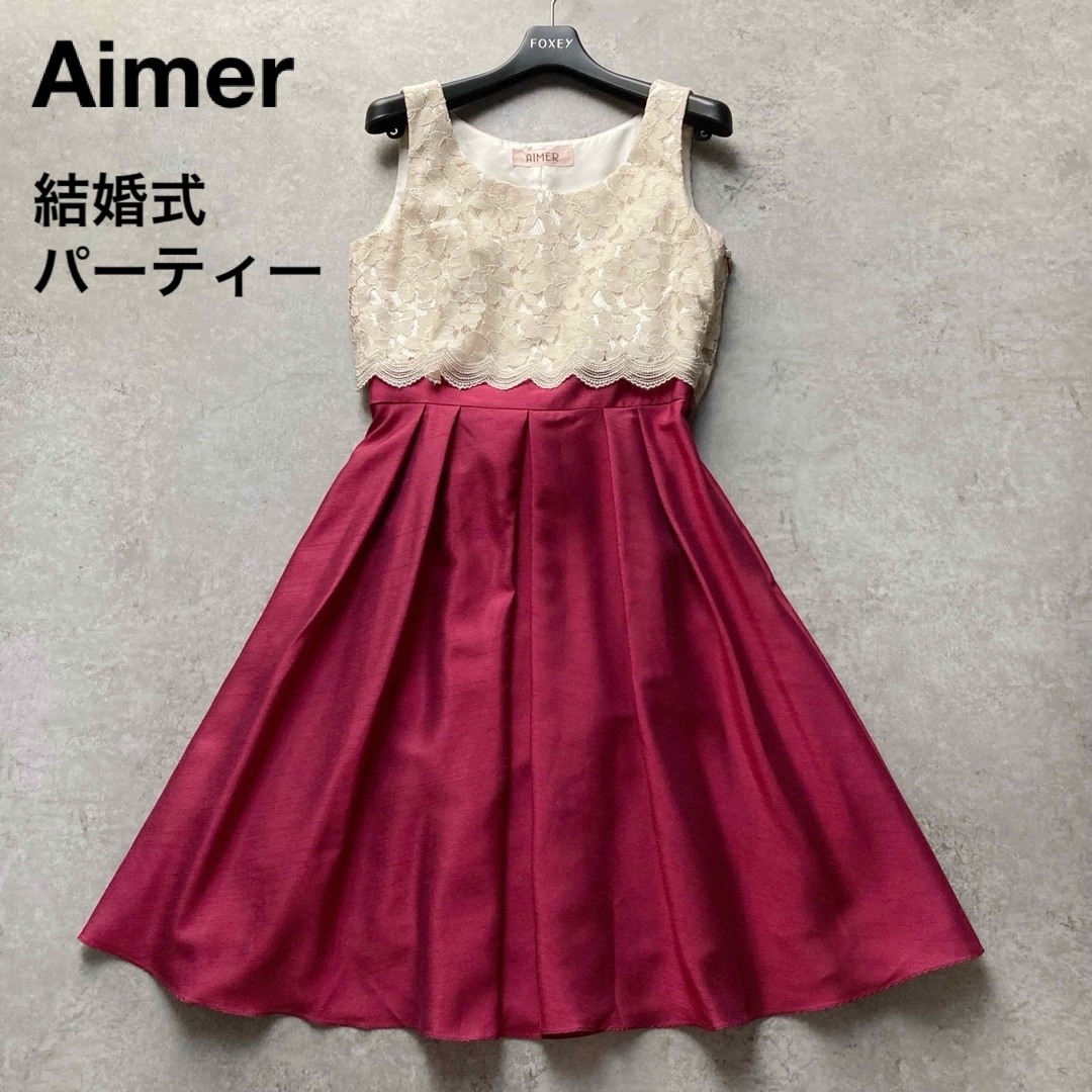 - 【美品】AIMER エメ レース×光沢 ドレスワンピース フレア ひざ丈 ウエストりぼん 結婚式 パーティー 演奏会