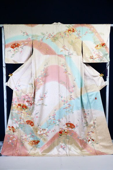 - 【送料無料】未使用品 訪問着 オフホワイト グレー パステル 枝梅 金彩加工 身丈166cm フォーマル 袷 正絹 仕立て上がり 着物フィ m-8187