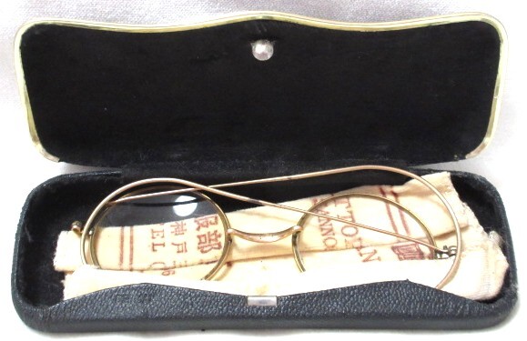 - 金色 / 丸眼鏡 / ツル式 / レンズ入り ◆ テンプル外れ / 要修理 ◆ 経年品 / ケース付き
