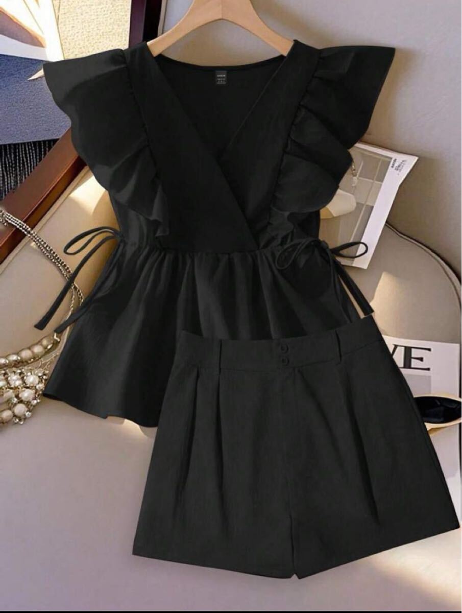 - ☆Franclia ☆新品 今期 2枚組 レディース夏 キュートなキャップ袖 Vネック フリルカラー ベストタンクトップ+カジュアルショーツ