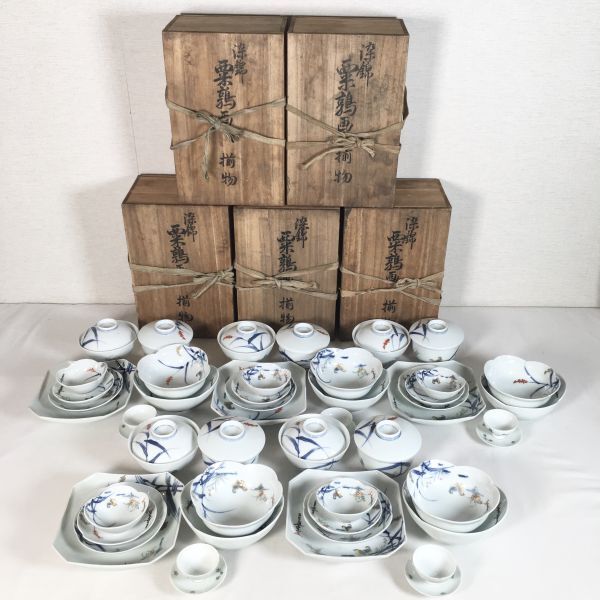 > 【9点×5セット/揃物/共箱付き】肥前 染錦 粟鶉画 三之丞 茶碗 飯茶碗 小皿 小鉢 皿 盃 酒器 お猪口 和食器