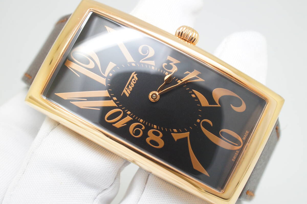 - Z11●作動良好 超美品 TISSOT ティソ バナナウォッチ T117509A スイス製 純正ベルト 黒文字盤 メンズ腕時計 ゴールド金×茶ベルト クォーツ