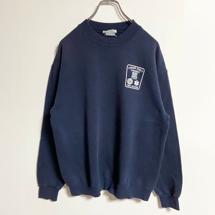 - 古着 used 長袖ワンポイントプリントスウェット トレーナー クルーネック バージニア ネイビー レトロ 秋冬服