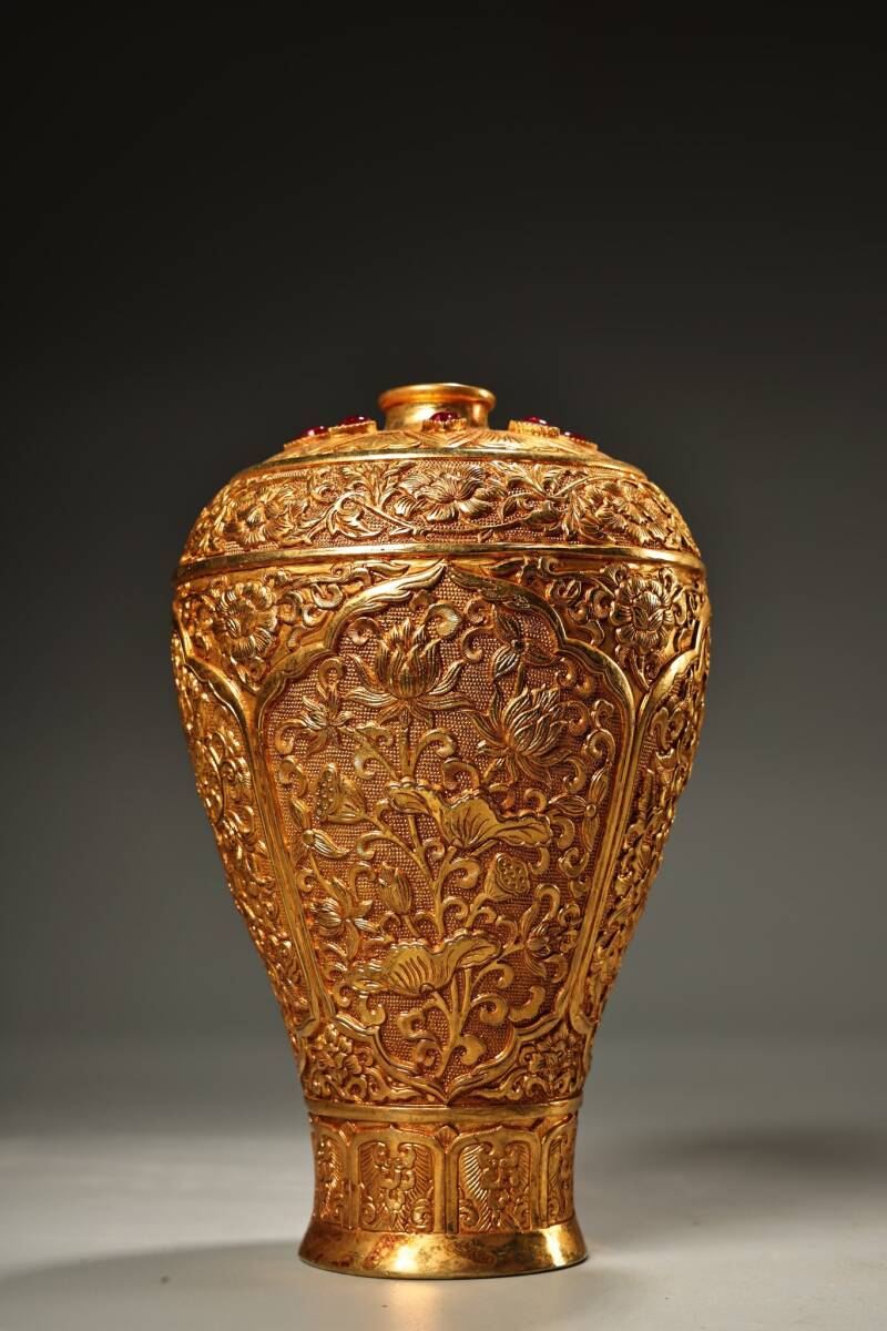 - 【超珍館蔵】銅製 塗金 梅蘭竹菊紋 花瓶 箱付 置物 賞物 古賞物 古董品 古美術品 時代物 旧家蔵出 稀少珍蔵品