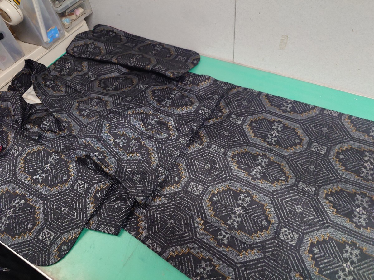 - ●大37 高級 大島紬 黒地 差し色 黄色 亀甲 結晶 風 柄 同窓会 観劇 美術館 オシャレ着 レトロ アンティーク 美品 ③