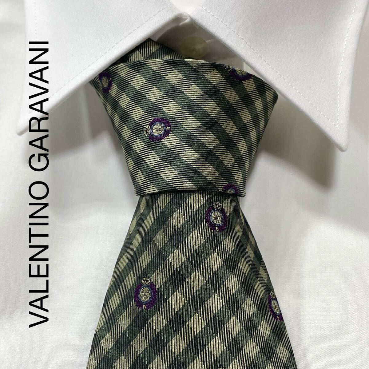 > VALENTINO GARAVANI ヴァレンティノガラヴァーニ パターン柄 チェック ジャガード シルク ネクタイ イタリア製 グリーン カーキ TG2825
