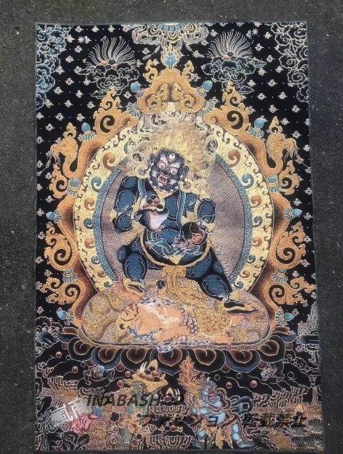 - 中国 チベット 密宗 密教 卍 ドンカ 金糸刺繍 錦絵 織物 仏像 仏画 黒き財神菩薩 仏教美術