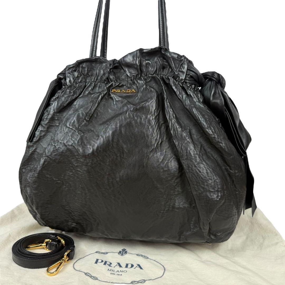 - Prada Nappa Leather Side Ribbon 2way Bag プラダ ナッパ レザー 本革 サイドリボン ショルダー 付き トート バッグ 斜めがけ ブラック 黒