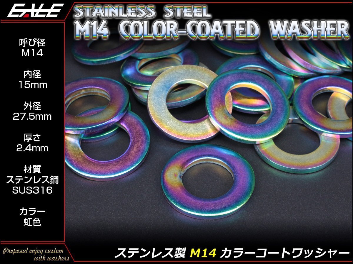 > ステンレス製(SUS316) M14用 カラーコートワッシャー 平ワッシャー 外径27.5mm 厚さ2.4mm 焼チタン風 虹色 JA005