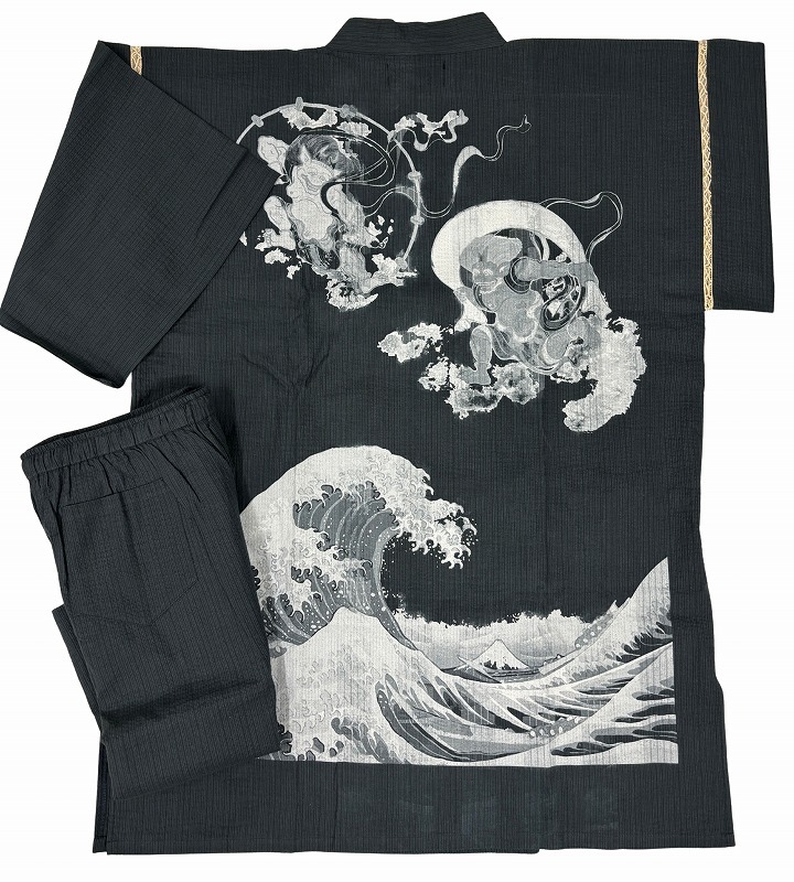 - [江戸てん]4L 訳あり 甚平 しじら織り 綿100% 捺染 風神雷神波(白一色) 紺